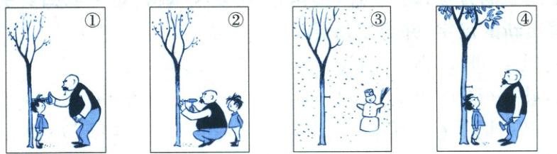 示例:春天,爸爸带着小明来到一棵小树下,爸爸让小明靠着小树,在小明头顶的位置做了个标记。冬天,下雪了,小明在树旁堆了个雪人。又到了春天,小明再次来到树下,发现去年做的标记超过了自己,小树长高了。