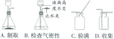 )。[四个实验装置图,A为制取装置,B为检查气密性装置,C为验满装置,D为收集装置]