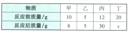 1.A 解析:根据质量守恒定律可得,$x=10+12+20-8-30=4$。反应后丙的质量增大,是生成物;甲、丁的质量减小,是反应物;反应前后乙的质量不变,乙可能是催化剂,也可能没有参与反应;所以该反应是化合反应。反应中甲和丙的质量变化之比为$(10g - 8g):(30g - 12g)=1:9$。