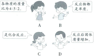 4. 关于化学方程式$4P + 5O_2\stackrel{点燃}{=\!=\!=}2P_2O_5$,四位同学表达了如图所示的四种说法,其中错误的是(