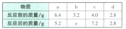 8.D 解析:反应后a的质量减小,是反应物;c的质量增大,是生成物,故A错误。d在反应前后质量没有变化,则d可能是催化剂,也可能没有参与反应,故B错误。根据质量守恒定律,x=6.4+3.2+4.0-5.2-7.2=1.2,故C错误。反应后b的质量减小,为反应物,故反应物为两种物质(a和b),生成物为一种物质(c),该反应为化合反应,故D正确。