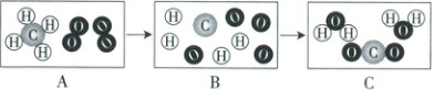 (1)由图示可以看出,B图示表示的是氢原子、碳原子、氧原子,C图示表示的是水分子和二氧化碳分子,则B到C的过程表示的是一个碳原子和两个氧原子结合成一个二氧化碳分子,一个氧原子和两个氢原子结合成一个水分子。