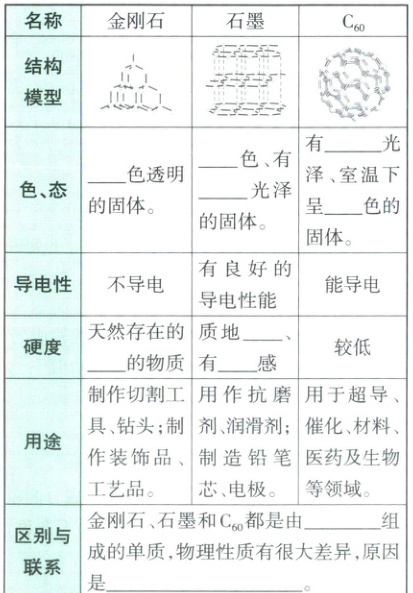 1.D 解析:金刚石、石墨由碳原子构成,C₆₀由C₆₀分子构成。