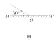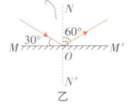 例2 如图甲所示,一束光射到平面镜$MM'$的$O$点处,请根据光的反射定律画出它的反射光线,并标明反射角的大小。 入射角$=90° - 30° = 60°$。