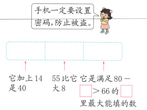 4. 26 47 13 解析:一个数加上14是40,那么这个数是40−14=26。55比一个数大8,那么这个数是55−8=47。满足80−□>66且□里的数要最大,此时80−□的差最小;大于66的最小的数是67,所以80−□=67,□=80−67=13。据此填写即可。