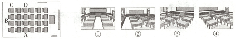 6. 新情境 生活体验 左下图是某教室的俯视平面图,淘气在A、B、C、D四个位置看到的景象按顺序依次是(
