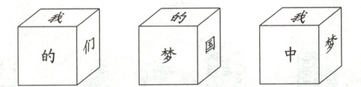 一个正方体,每个面上分别写有“我、们、的、中、国、梦”中不同的一个字,从不同的位置观察到的结果如图所示。这个正方体相对的两个面上的字分别是什么?(不考虑字的方向)