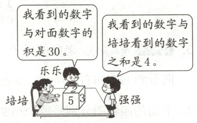 2. 4在2的对面 乐乐看到的数字对面的数字是5,且他看到的数字与5的积是30,所以他看到的数字是6,则5的对面是6。强强看到的数字是3,且他看到的数字与培培看到的数字之和是4,所以培培看到的数字是1,则3的对面是1,所以2的对面是4,即4在2的对面