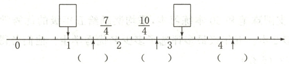 6. 在直线上面的$□$里填上假分数,在下面的($$)里填上带分数。