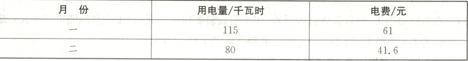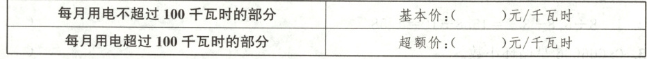 解析:从题表中可以看出,80千瓦时的电费是41.6元,据此求出基本价是41.6÷80=0.52(元/千瓦时)。115千瓦时中有100千瓦时按基本价计费,其余的按超额价计费,100千瓦时的电费是100×0.52=52(元),超过100千瓦时的部分的电费是61−52=9(元),也就是超过部分的15千瓦时的电费是9元,据此求出超额价是9÷15=0.6(元/千瓦时)。