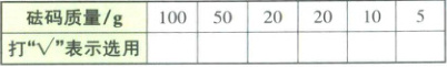 (2)称量:用质量为23.1 g的烧杯作称量容器,在托盘天平上称取氢氧化钠固体时,盛有氢氧化钠固体的烧杯应放在(填“左”或“右”)盘。在下表所列的砝码中,选出所需砝码(打“√”表示选用)。