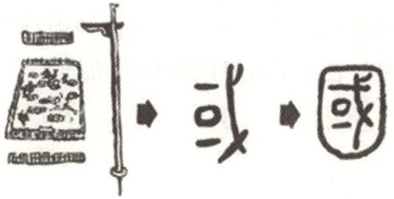 “国”字原作“或”,按古人的理解,国家应该是由“口”——人口、“一”——疆土和“戈”——军队组成的。在小篆字体中,“或”被写作“国”,像是被边界线紧紧包围。这说明 (