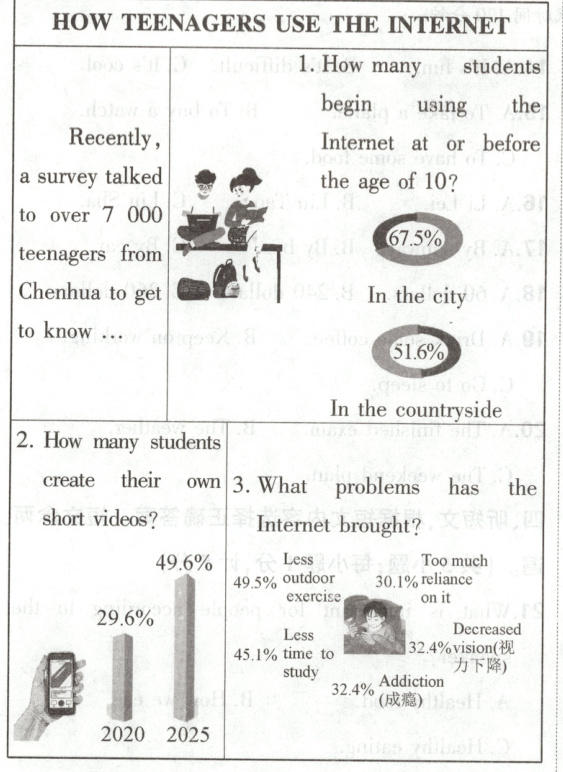 [语篇导读]本文是一篇说明文。文章通过图表形式呈现了一项关于Chenhua地区的青少年使用互联网情况的调查,调查内容包括在城市和农村地区,10岁及以前开始使用互联网的青少年的比例、创作自己的短视频的学生的数量以及互联网带来的问题。