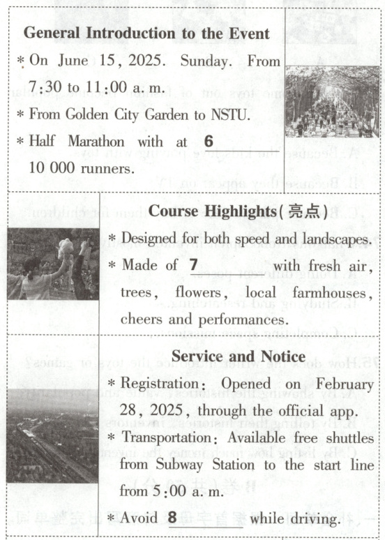 [语篇导读]本文是一篇新闻。文章主要介绍了2025年城市半程马拉松赛事的相关信息,包括举办时间、起终点、赛程、最多参赛人数和赛道途经之处。文章还说明了报名方式、交通安排和道路封闭情况,以及该赛事的历史和参加该赛事的好处。