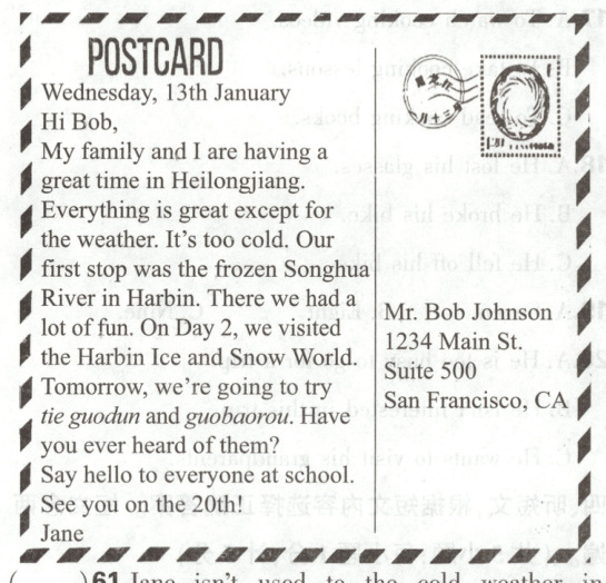 )61.Jane isn't used to the cold weather in Heilongjiang.(