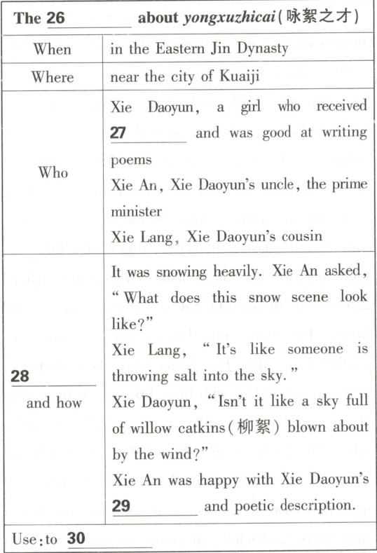 26.story / tale 27.(much) education 28.What 29.(far more) natural 30.show a symbol of woman talent