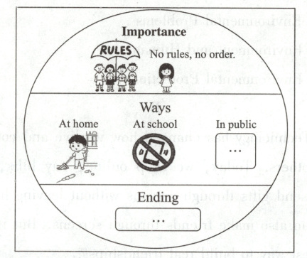 We should help do chores at home. It teaches us responsibility. We are not supposed to take mobile phones to school. Students must pay attention to schoolwork. In public places, environmental and traffic rules should be kept in mind. We need to keep public areas orderly and show respect to others.