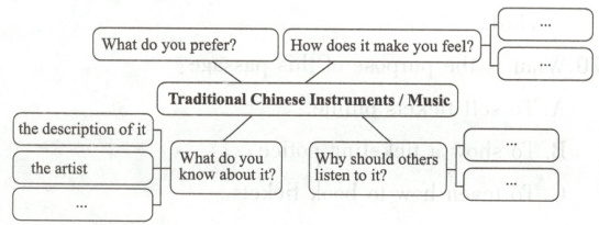 器,如琵琶(pipa)、管子(guanzi)、笛子(dizi)、萧(xiao)、高胡(gaohu)、鼓(drum)等。假如你叫李华,请根据下面的思维导图,给笔友Jim写一封信,向他介绍你最喜欢的一种中国传统乐器或者一首中国民乐曲。注意: