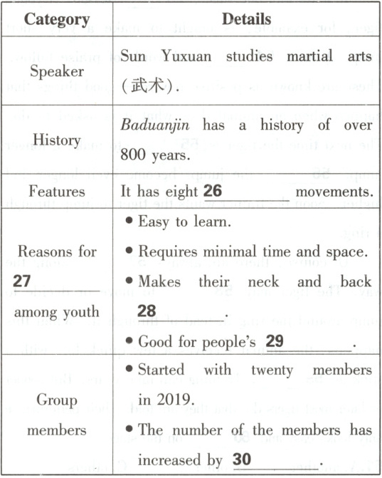 五、听短文,根据短文内容完成图表中所缺信息。短文念三遍。(共5小题;每小题1分,计5分)