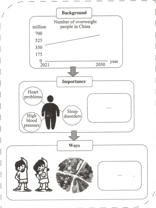 Nowadays, the number of overweight people in China is increasing. It was 350 million in 2021 and may reach 700 million by 2050. Being overweight is harmful to health. It can cause heart problems, high blood pressure and sleep disorders. So weight management is important. To manage weight well, we should do more exercise, like playing sports. Also, we need to eat healthy food, such as fruits and vegetables. Let's keep a healthy lifestyle together.
