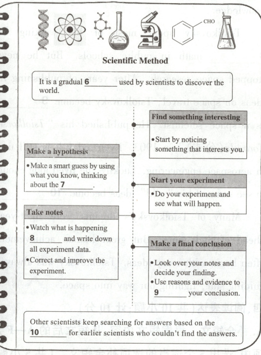 【语篇导读】本文是一篇说明文。文章描述了科学家进行科学研究时使用的科学方法,包括以下步骤:观察感兴趣的事物、提出假设、进行实验、记录数据、得出结论等,以及这种方法的作用。