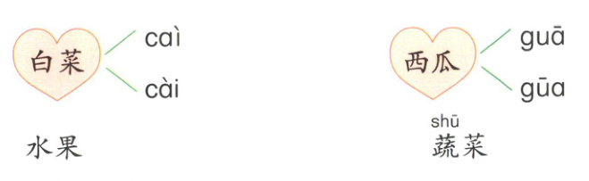 二、cài guā 白菜—蔬菜 西瓜—水果 【解析】本题考查会认字的读音和课文内容。“白菜”的“菜”读cài,“西瓜”的“瓜”读guā。“白菜”是蔬菜,“西瓜”是水果。