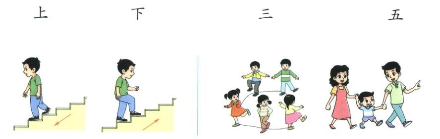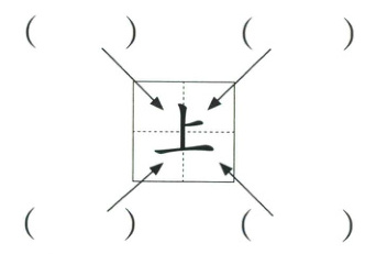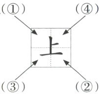 【解析】本题考查认识田字格和在田字格中书写汉字。田字格分为四个部分,左上角是“左上格(①)”,右上角是“右上格(④)”,左下角是“左下格(③)”,右下角是“右下格(②)”,按此填入对应括号。“上”的书写顺序为“竖、横、横”,共3画,第一笔是丨。汉字书写中,“竖”画通常以田字格的“竖中线”为参照,因此第一笔“竖”应写在①竖中线上。