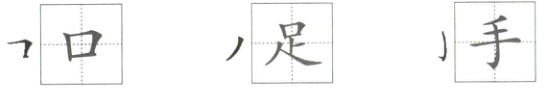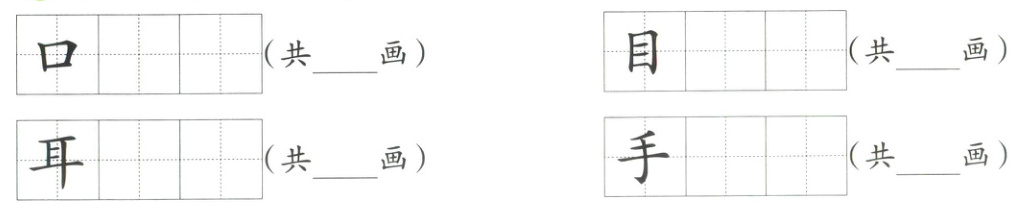 [解析]本题考查汉字书写。书写时,注意“口”和“目”的第二笔都是横折,“耳”笔顺分别是横、竖、竖、横、横、横。“手”的最后一画是弯钩。数笔画数时要认真,不要数错。