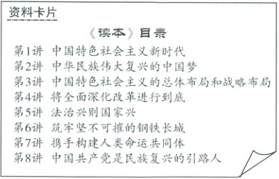 受到党中央大兴调查研究的决定的启发,你校计划针对《习近平新时代中国特色社会主义思想学生读本(初中)》(以下简称《读本》)的学习情况,开展调查研究。作为校团委学生干部,你组织部分共青团员整理出了一份《读本》目录资料卡片,并结合资料卡片内容开展活动。