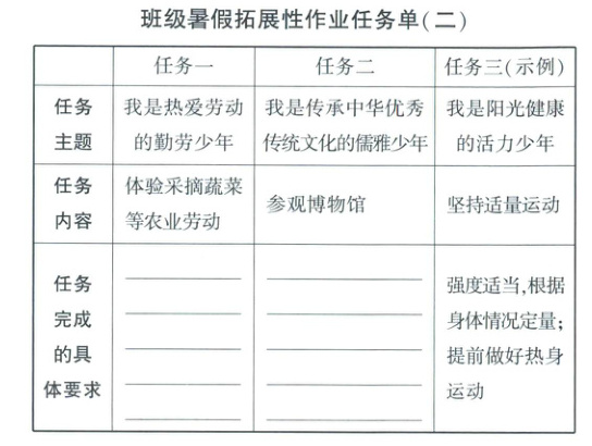 学习其他学校的先进经验后,你校号召各班自主设计暑假作业任务单。作为学习委员,你负责班级暑假拓展性作业的设计工作。