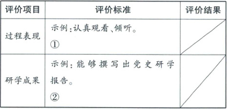 (3)本次活动的主要步骤是:线上浏览党史博物馆实景→观看党史博物馆讲解视频→小组交流研讨→研学成果校级展示。为明确活动要求,检验和提升活动实效,以评促学,你组织同学们自主设计活动评价标准,需要完成以下表格。(4分。每填写两条,每条1分)