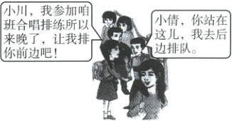 11.A【解析】本题考查遵守社会规则、尊重他人、以礼待人等相关知识。解答漫画类试题,既要审视漫画的寓意,更要理解图中文字蕴含的相关信息。结合漫画中人物的言行及设问指向要求,A项表述正确且符合题意。B项“没有底线意识”表述错误。小倩插队的行为是错误的,C项、D项应排除。故本题选A。
