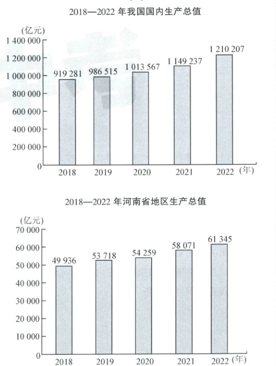 9.C 【解析】本题考查经济建设和河南省情发展等相关知识。解答图表类试题要注意“四看一比较”:看试题设问、看图表标题、看图表数据变化、看图表注文,对图表坐标进行横纵比较等。仔细观察两幅图表,由图中数据可知,2022年河南省地区生产总值占全国比例约5.1%,远不足50%,C项错误。故本题选C。