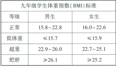 19.(8 分)某初中结合国家“体重管理年”活动要求,让同学们用体重指数计算公式$BMI = \frac{体重(kg)}{身高(m^2)}$算出自己的体重指数,并依据体重指数标准(如下表)进行体重管理。九年级女生甜甜自从算出自己的体重指数为 23 后,便开始不吃早餐,午餐、晚餐也不吃主食。妈妈很着急,告诉她这样做不科学,甜甜却说:“我这样做是在管理自己的体重,没有错。”