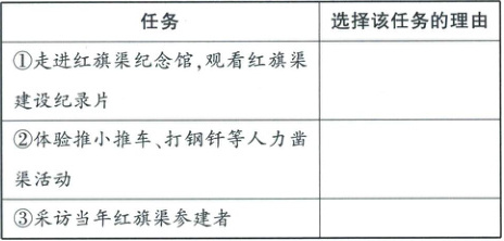 (2)①全面了解红旗渠建设历程,感受红旗渠精神的伟大。②亲身体验当年修渠的艰辛,具有参与性,留下深刻印象。③可以获取红旗渠建设的一手历史资料,培养沟通共情能力。(任选两项作答,理由充分即可,共4分)