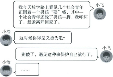 未成年人身心发育尚不成熟,容易受到不法侵害,应学会自我保护。小飞路遇不法侵害赶紧离开,是有自我保护意识的表现,值得肯定。 同违法犯罪行为作斗争,是包括青少年在内的全体公民义不容辞的责任。看到社会青年勒索殴打男孩。小飞一走了之,是法治意识淡薄、缺乏正义感的表现,不宜提倡。 面对违法犯罪,未成年人应在保护自己的前提下,巧妙借助他人或社会力量,采取机智灵活方式,有勇有谋地同违法犯罪作斗争,维护社会公平正义。(8分)
