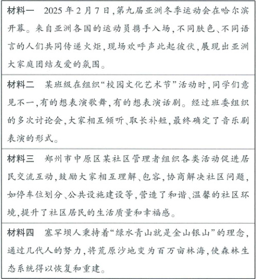 18.(6分)材料一:亚洲冬季运动会开幕式上各国运动员携手同行、共同传递火炬,体现了他们和平共处、团结协作,促进不同文化交流互鉴,展现了人类命运共同体理念下的和谐之美。 材料二:同学们面对活动方案产生分歧,通过讨论倾听、取长补短确定方案,体现了他们在人际交往中相互尊重、包容差异,以协商方式化解矛盾,促进集体和谐发展。 材料三:社区居民相互理解、包容,体现了和为贵的思想,促进社区和谐,增进了邻里之间的感情,营造了和谐、包容的社区氛围。 材料四:塞罕坝人深刻认识到天人合一,人与自然是一个有机整体,变沙漠为林海,实现了人与自然的和谐共生。 建议:能够结合材料一一对应写出对“和”的内涵和价值的认识。