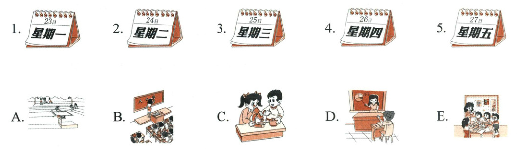 二、Amy 和丽丽在看课程表,她们在谈论这一周的课程。将星期与课程连线。