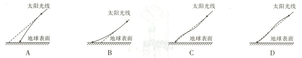 5. 地球表面附近空气的折射率随高度降低而增大,太阳光斜射向地面的过程中会发生弯曲。下列光路图中能描述该现象的是(