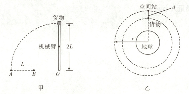 (3)在机械臂作用下,货物、空间站和地球的位置如图乙所示,它们在同一直线上,货物与空间站同步做匀速圆周运动。已知空间站轨道半径为r,货物与空间站中心的距离为d,忽略空间站对货物的引力,求货物所受的机械臂作用力与所受的地球引力之比F₁:F₂。