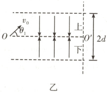 在第一段电场中,竖直方向上有$d = v_0' \sin \theta_{2m} × t_0 - \frac{1}{2} × \frac{qE}{m} × t_0^2$,