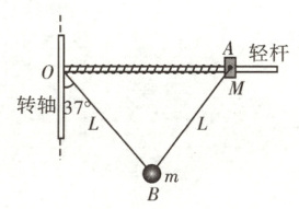 (2)设装置转动的角速度为$\omega$,对A进行受力分析,由弹簧弹力提供向心力,有$F = M \omega^{2} · \frac{8}{5}L$,同理,对B进行受力分析,由细线OB张力的水平分力提供向心力,有$mg \tan 53^{\circ}=m \omega^{2} · \frac{4}{5}L$,联立解得$M=\frac{9}{64}m$。
