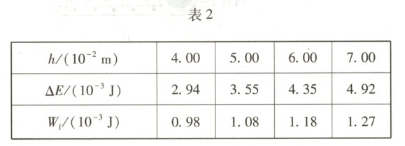(5) 用图丙的装置,按表1中所列部分高度h进行实验,测得摩擦力做功大小$W_{测}$。由于观察到H值较小,小明认为,AO过程摩擦力做功近似等于AB过程的一半,即$W_f = \frac{W_{测}}{2}$。然后通过表1的实验数据,计算出AO过程损失的机械能$\Delta E = \Delta E_p - \Delta E_k$。整理相关数据,见表2。