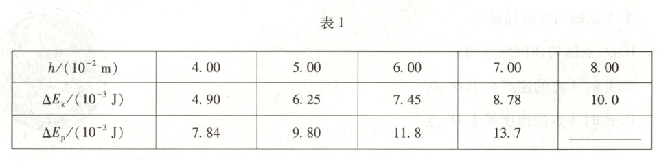 (3)根据$\Delta E_{p}=mgh$,代入数据可得$\Delta E_{p} \approx 15.7 × 10^{-3}J$,则题表1中应补充的数据为15.7。