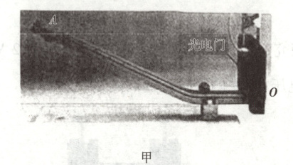 11. (15分) 小明同学探究机械能守恒定律,实验装置如图甲。实验时,将小钢球在斜槽上某位置A由静止释放,钢球沿斜槽通过末端O处的光电门,光电门记录下钢球的遮光时间$t$。用游标卡尺测出钢球的直径d,由$v = \frac{d}{t}$得出其通过光电门的速度v,再计算出动能增加量$\Delta E_k = \frac{1}{2}mv^2$。用刻度尺测得钢球下降的高度h,计算出重力势能减少量$\Delta E_p$。