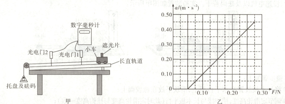 (3) 将托盘及砝码的重力视为小车受到的合力$F$,改变砝码质量,重复上述步骤,根据数据拟合出$a - F$图像,如图乙所示。若要得到一条过原点的直线,实验中应