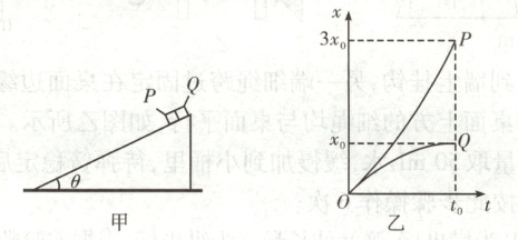7. [2025·辽宁卷,10T,6分](多选)如图甲,倾角为$\theta$的足够长斜面放置在粗糙水平面上。质量相等的小物块$P$、$Q$同时以初速度$v_0$沿斜面下滑,$P$、$Q$与斜面的动摩擦因数分别为$\mu_1$、$\mu_2$,整个过程中斜面相对地面静止。$P$和$Q$的位置$x$与时间$t$的关系曲线如图乙所示,两条曲线均为抛物线,$Q$的$x - t$曲线在$t = t_0$时切线斜率为0,则 (