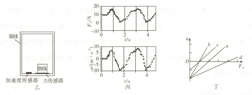 (2) 利用图乙装置进行实验,箱体的水平底板上安装有力传感器和加速度传感器,将物体置于力传感器上,箱体沿竖直方向运动,利用传感器测得物体受到的支持力$F_{ N}$和物体的加速度$a$,并将数据实时传送到计算机。