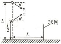 6. [2025·湖北卷,6T,4分]某网球运动员两次击球时,击球点离网的水平距离均为$L$,离地高度分别为$\frac{L}{2}$、$L$,网球离开球拍瞬间的速度大小相等,方向分别斜向上、斜向下,且与水平方向夹角均为$\theta$。击球后网球均刚好直接掠过球网,运动轨迹平面与球网垂直,忽略空气阻力,$\tan\theta$的值为