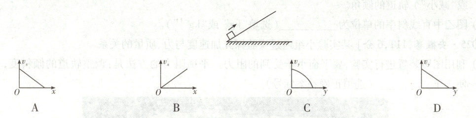 5. [2025·湖南卷,2T,4分]如图,物块以某一初速度滑上足够长的固定光滑斜面,物块的水平位移、竖直位移、水平速度、竖直速度分别用$x$、$y$、$v_x$、$v_y$表示。物块向上运动过程中,下列图像可能正确的是